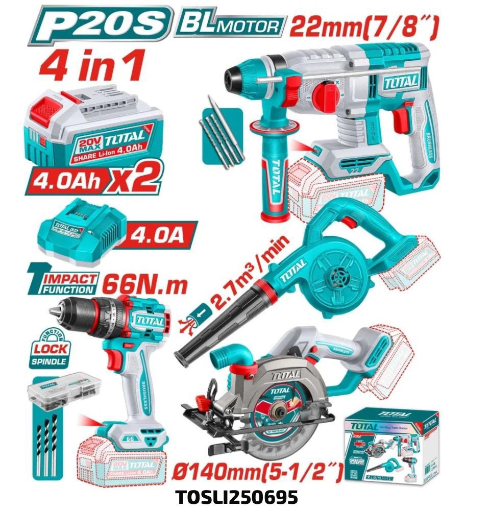 Combo 4 herramientas Inalámbricas Total 20V (TOSLI250695). Incluye atornillador percutor de 66Nm, rotomartillo SDS Plus, sierra circular 5-1/2″ y soplador. Potencia profesional con motores Brushless, 2 baterías de 4.0Ah y cargador rápido de 4A. Ideal para construcción y taller.