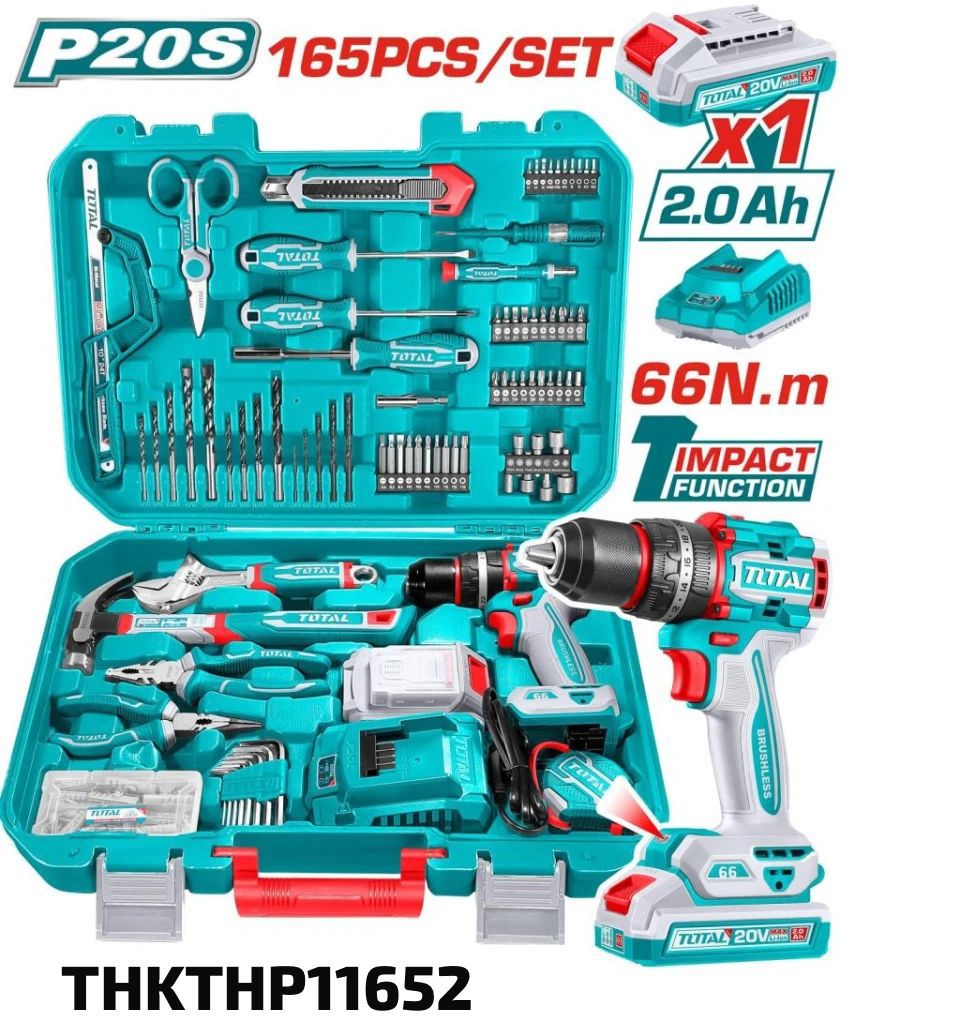 Kit Taladro Percutor Inalámbrico Total 20V + 165 Accesorios (THKTHP11652).
