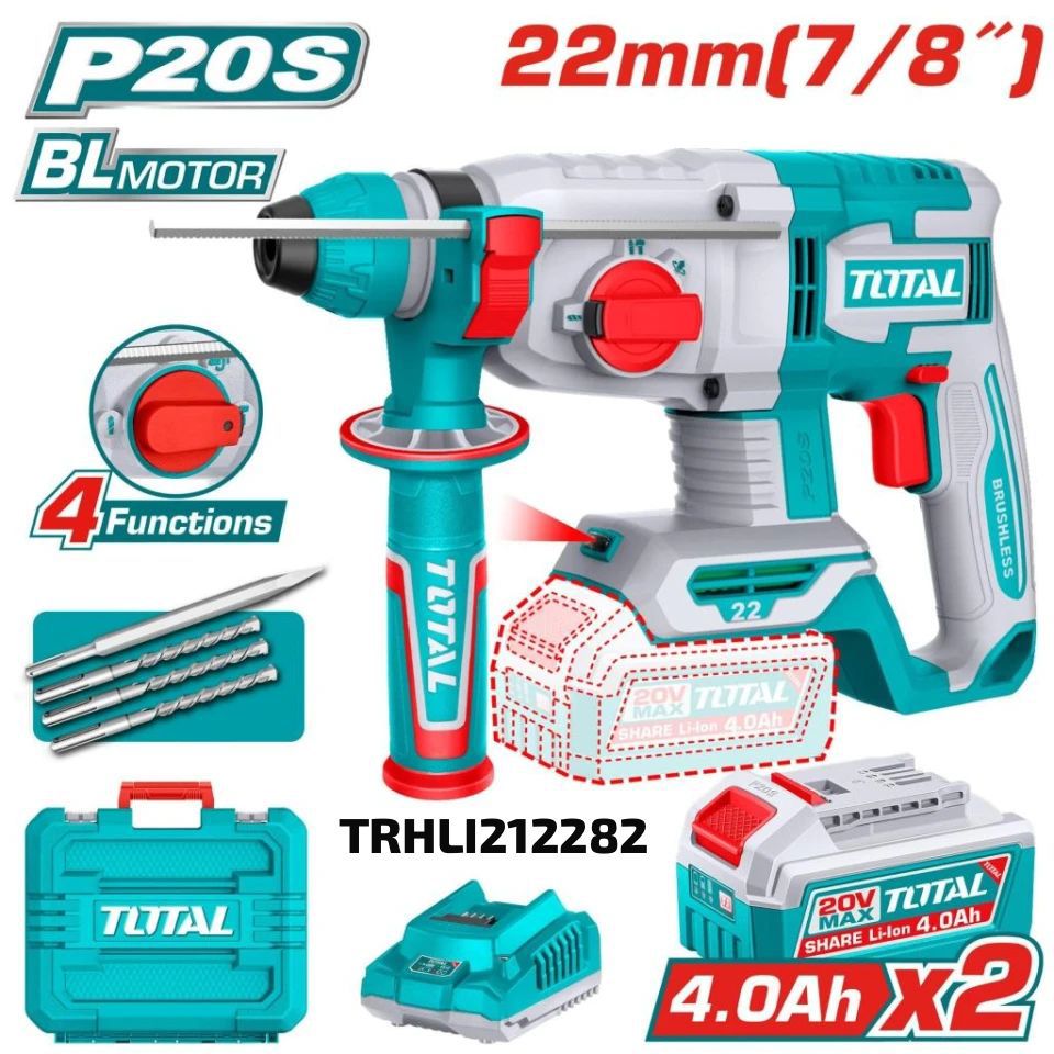 Potente Rotomartillo Inalámbrico TOTAL 20V (TRHLI212282) con motor Brushless y 2.0 Joules. Incluye 2 baterías de 4.0Ah y cargador. Ideal para perforación industrial de hasta 22 mm en hormigón, alta eficiencia SDS Plus